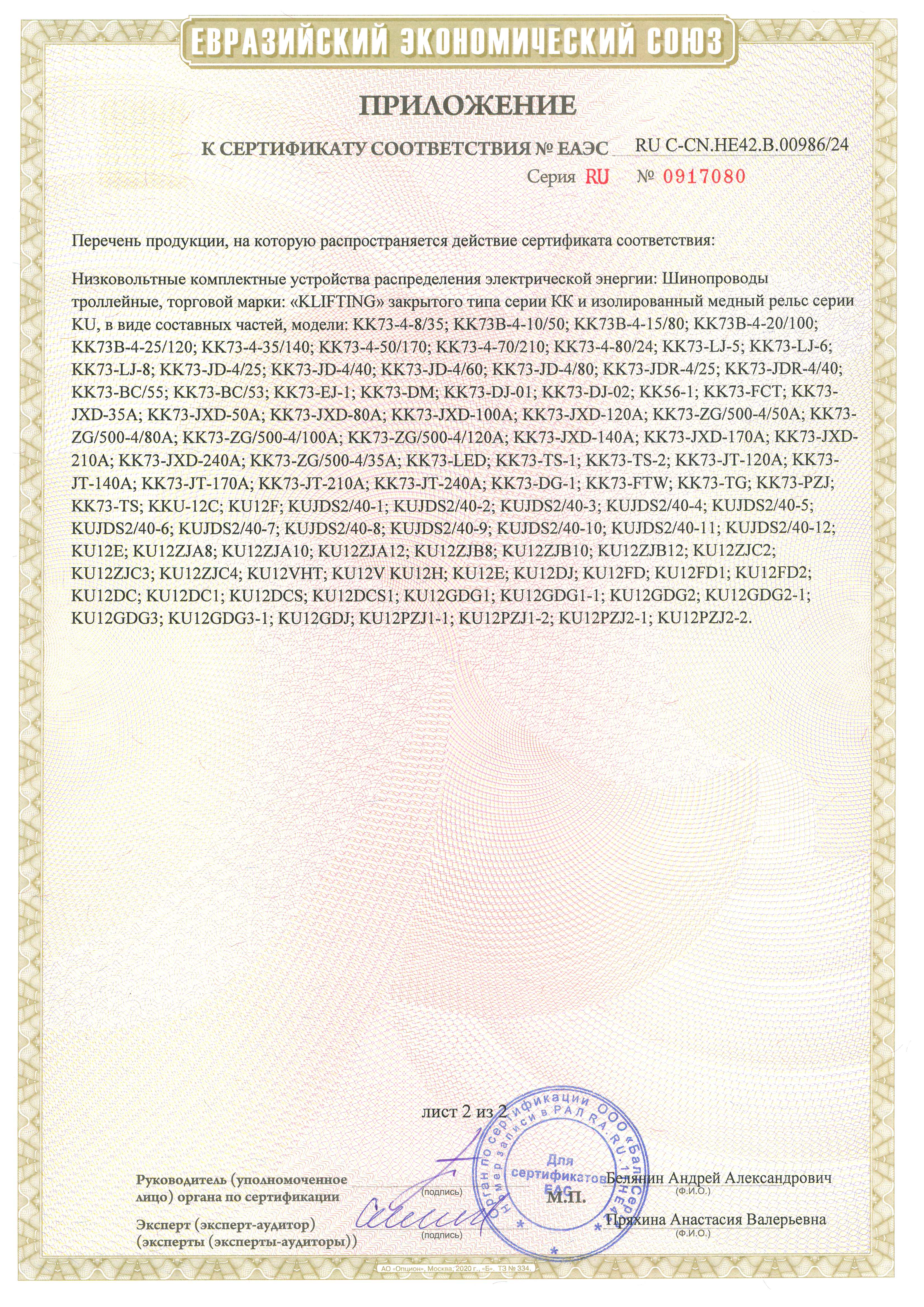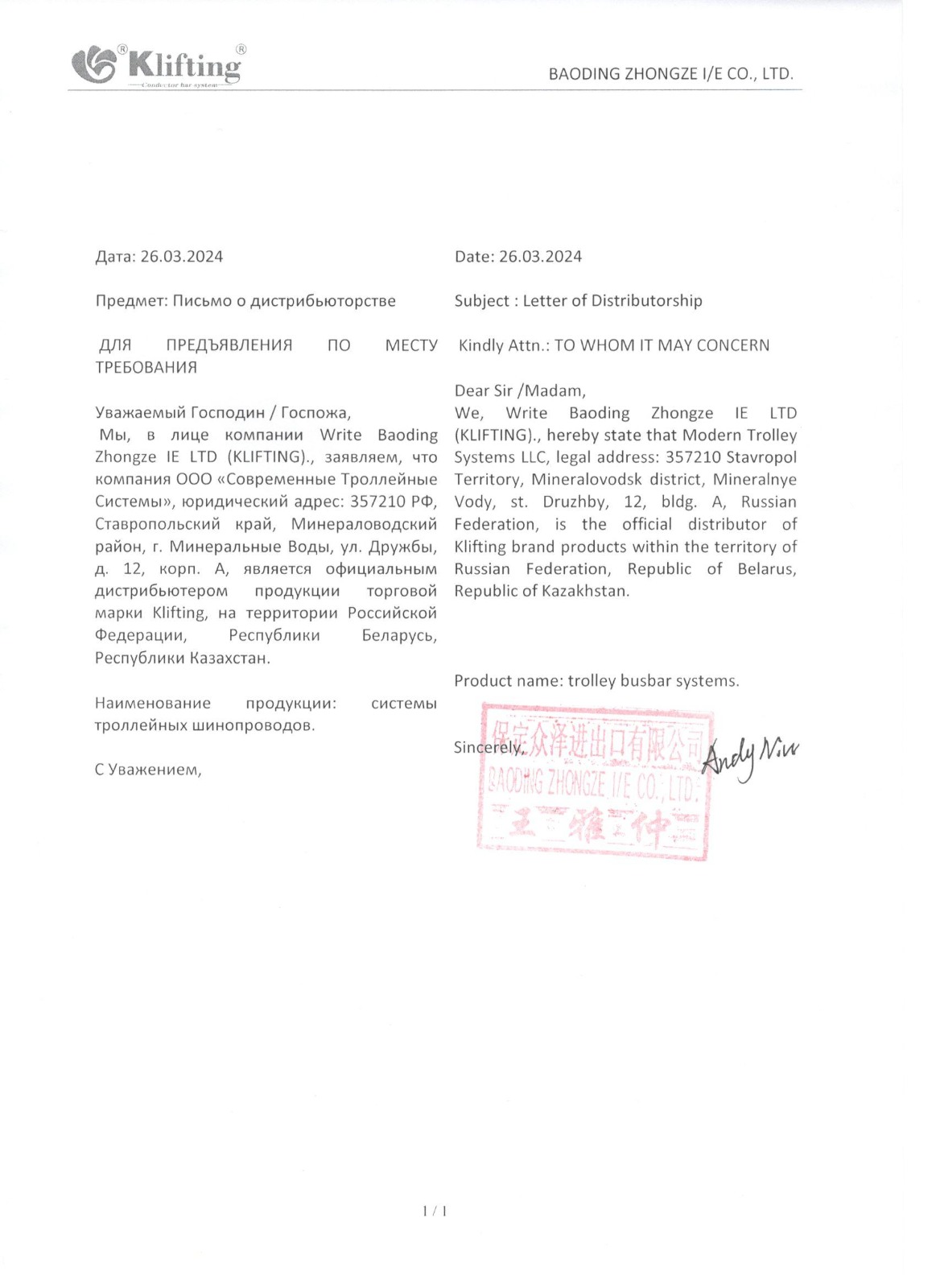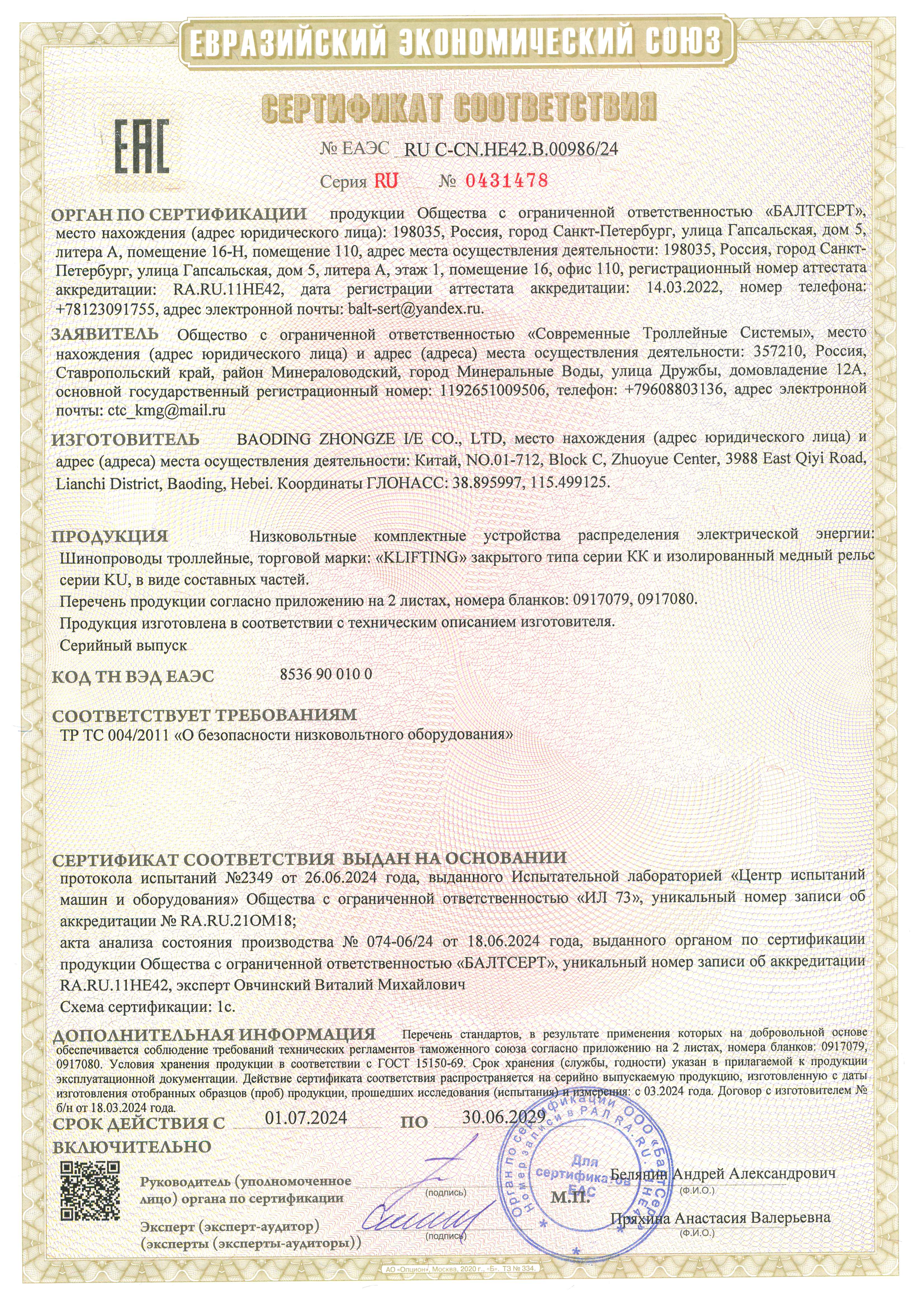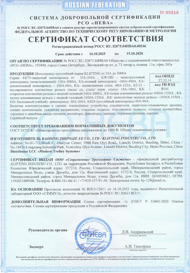 Наша компания, ООО «Современные Троллейные Системы», гордится тем, что является официальным дистрибьютером продукции торговой марки Klifting. Мы предоставляем только сертифицированные продукты высокого качества, соответствующие всем стандартам безопасности и надежности. Наши сертификаты подтверждают соответствие нашей продукции всем необходимым требованиям и гарантируют ее безупречное качество. Приобретая продукцию Klifting у нас, вы можете быть уверены в надежности и безопасности вашего оборудования.